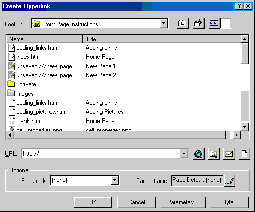 From there, you can type in the URL to an external web site, or double-click on the name of another page in your site.