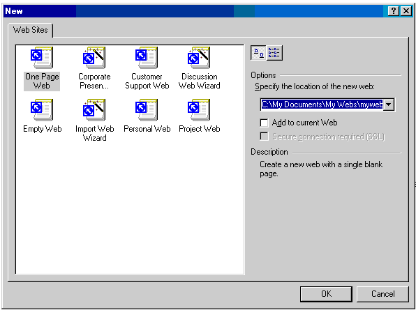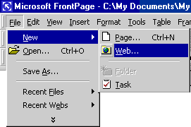 To make a web page, start by creating a new "web" from within Microsoft FrontPage. A "web" is just a special folder on your computer which contains all the files that are part of your web site. Usually, these special folders go in the My Documents \ My Webs folder.